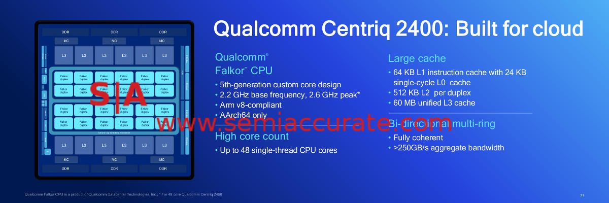 Even with this in mind, for the majority of the market, Centriq should be a clean kill. The 4x price advantage puts the pricing of a 2460 in the $2500-3000 range vs $10,000-13,000 for the Xeon. This is more than enough of an advantage to tempt buyers and that is before the ‘extras’ like cache QoS software which Intel charges for but Qualcomm includes for free. SemiAcccurate expects Qualcomm to do quite well with the Centriq line, but as usual with the megadatacenter crowd, large deployments take time. By this time next year, expect Intel to be taking large hits from at least three sides, Qualcomm being one with Centriq 2400.S|A
