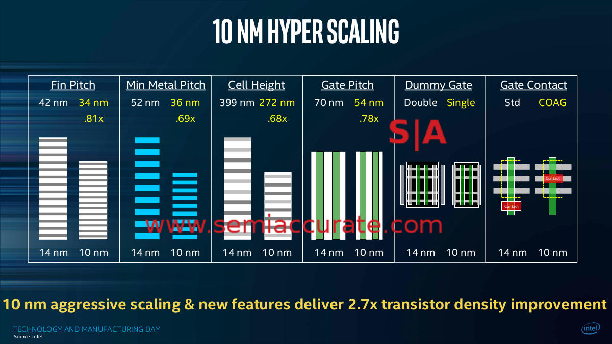 What Intel is not telling you, or the analysts, is that the 10nm you may get in late 2019 is not the 10nm they had intended to come out in 2015. More importantly this new process is a significant step backward from the 10nm they promised, as touted in their manufacturing day. How much of a step backwards? Several of SemiAccurate’s moles are saying it is effectively a 12nm process rather than a 10nm process, and the technical changes more than back that claim up. Don’t expect this to ever be publicly admitted to, it is still ’10nm’ and always will be even if the tech doesn’t back that name up.