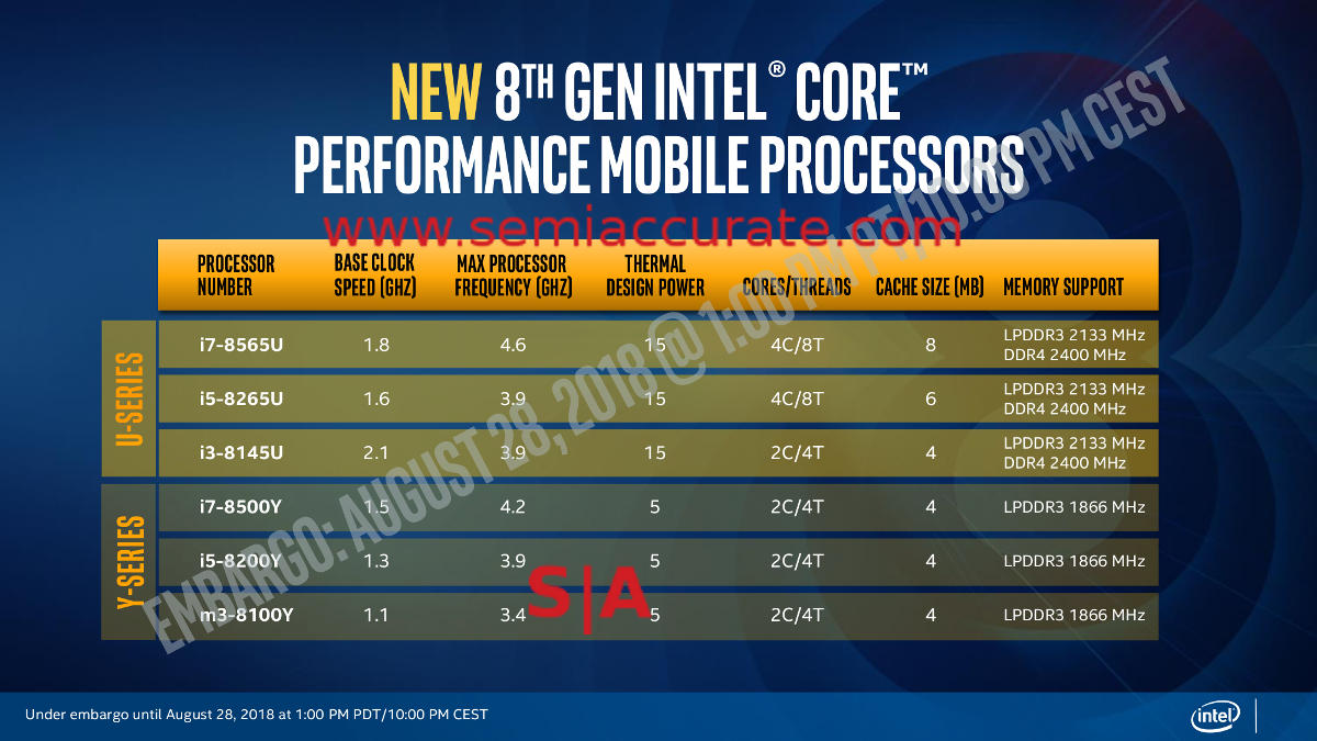 Lets start out with the good news, there are six new Intel mobile CPUs, three 15W U-Series and three 5W Y-Series. The top two Us are 4C/8T while the remaining parts are 2C/4T. These parts are still labeled 8th Gen but since the last three or four generations are all Sky Lake with vanishingly small tweaks, SemiAccurate considers this nomenclature to be worthless. The lineup looks like this.