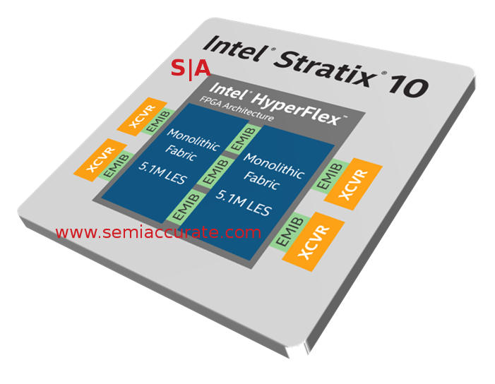 SemiAccurate has been following the march of chip construction for several years and and the Stratix 10 GX 10M is one of the more advanced of the breed, with a caveat to be explained later. Take two Stratix 10 GX sans 10M dies with an individual capacity of 5.1M logic elements and stitch them together via three (in the diagrams anyway) EMIB bridges. The result is a 10.2M element FPGA that has a 10M suffix, something Intel says is a world record.