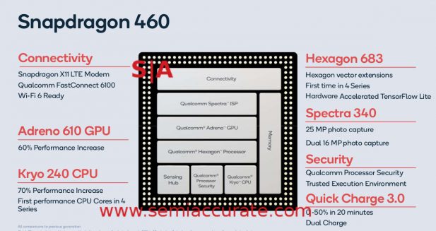 Lets start out with the lowest end of the line, the Snapdragon 460, the successor to the current 450. It is obviously the least expensive of the parts released today but it still comes with an X11 modem aka 390/150Mbps down/upstream, not bad for a ‘value’ part. Carriers will love this one because the more they can push higher Cat LTE devices to the masses, the more efficient their networks become and, well, profit.