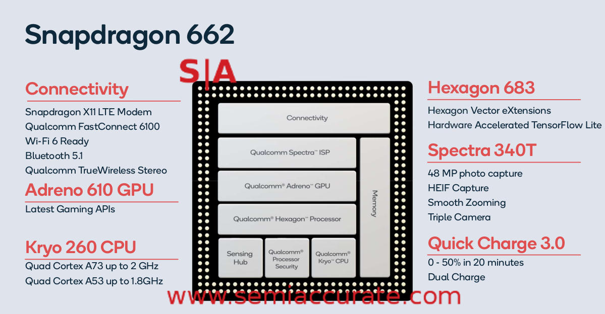 One addition SemiAccurate wasn’t expecting is the Security Processor on the 720G. While we think this is a good thing, we just assumed it was in the entire line, not just the high end parts. The inclusion of such a small block in the 720G and not the 662 tells us that it is not an economic choice, the entire platform needs to support it at a very granular level. Until all those blocks trickle down to the lower tiers, you won’t see the latest security features there. This could have serious implications on the uptake of the platform in Asia if competitors offer features in lower cost models first. That said given how hard security is to do right, this is a bit unlikely but don’t ignore the risk.