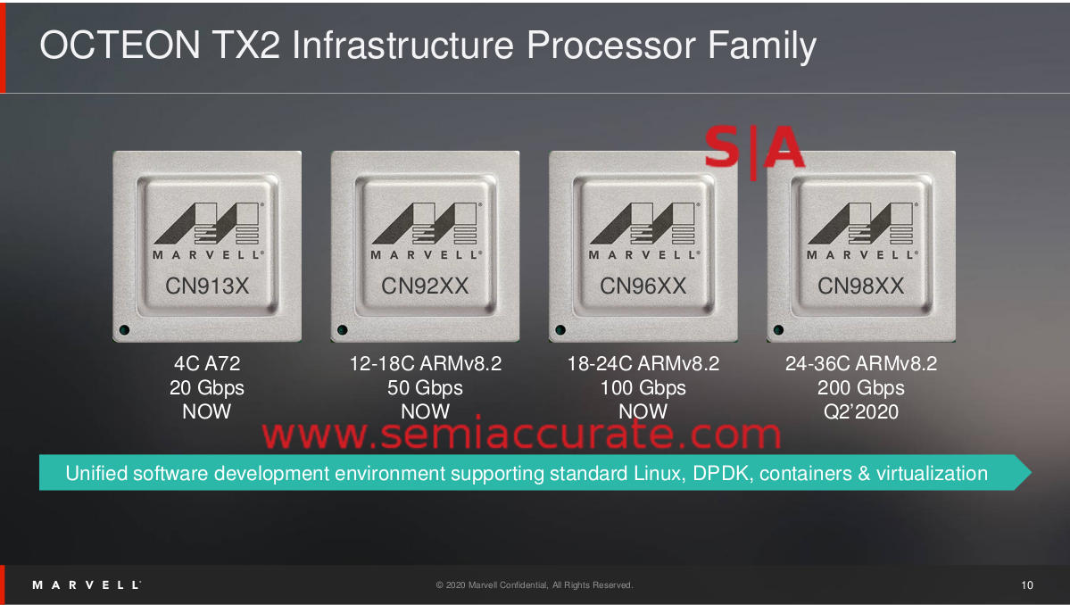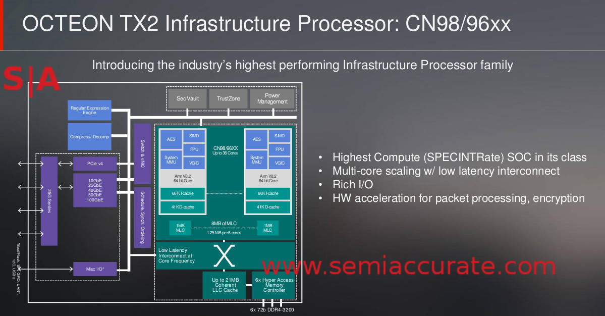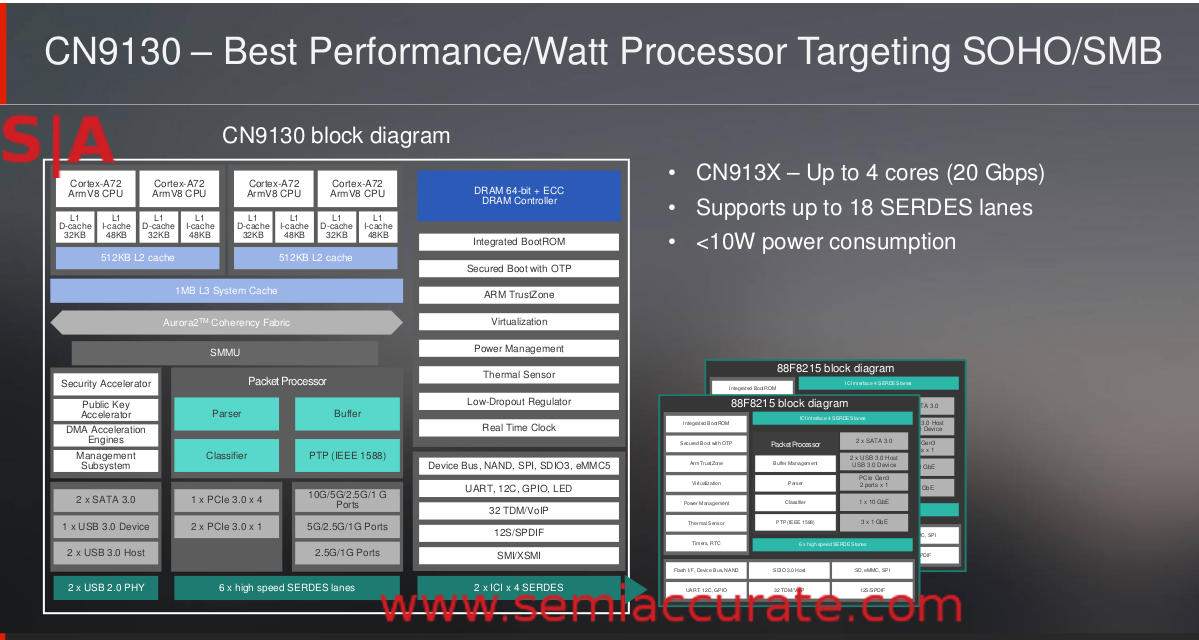 Basing it on standard components makes a lot of sense, there is only so far you can scale down the big chips, after a certain point the interconnects and ancillary bits eat up more die than they are worth. Pulling off selected accelerators and placing them on a device much better suited to this market segment makes a lot of sense to SemiAccurate. The end result is a cheaper device that still does the needed work and more importantly is still capable of running the same software as the bigger TX2s so it is a win/win for Marvell and customers.