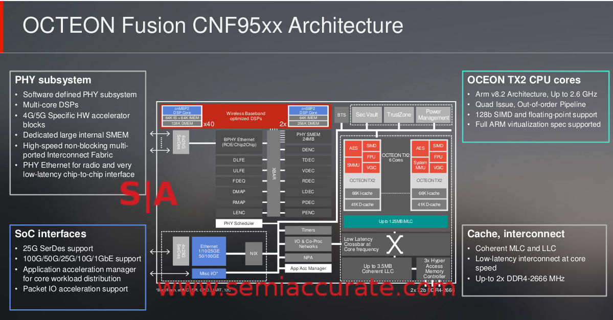 If you want to build a 5G macro base station you can take a few TX2s, slap a bunch of baseband chips in front, throw in a few FPGAs, add a little more support silicon, or just go the full ASIC route. If you don’t like pain and needless work, you might want to consider the new Octeon Fusion line. Imagine a lower end TX2 with all the PHYs and protocol engines, baseband capabilities, and DSPs you need already on board. It looks like this.