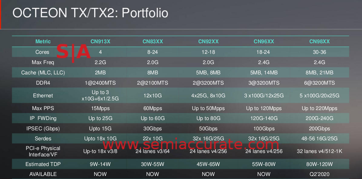 Core counts do go up too from the 24 in the CN83xx to 36 in the CN98xx, and that is on top of their architectural upgrades. The CN98xx has 4x the throughput of the CN83xx but only 50% more cores. That ratio should give you a good idea of the improvements to the cores themselves, these are not the simple devices of the first gen Cavium/Marvell parts anymore.
