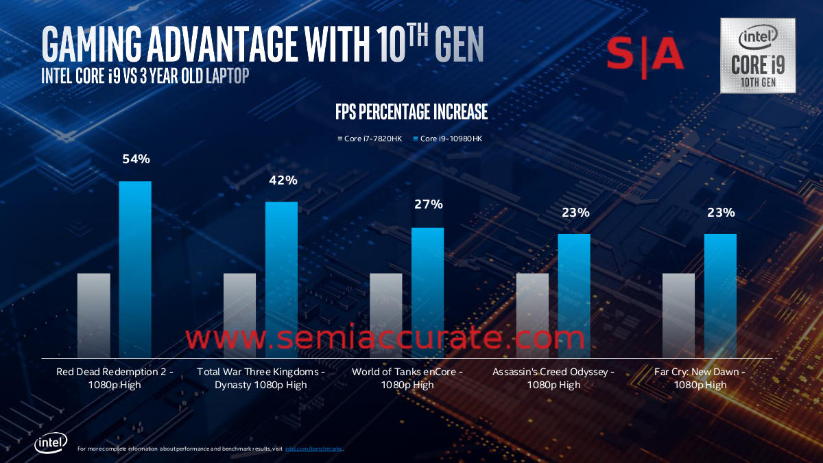 Since Intel does not provide SemiAccurate with samples to test, we have to rely on Intel’s internal numbers. We asked for comparisons vs the last generation 9-Series -H SKUs and against Ice Lake SKUs but Intel would not provide those. No points if you can figure out why. Comparisons vs AMD’s Ryzen 3K are similarly absent, it is too early for Intel to get and test Ryzen 4K parts but we don’t expect them to ever post those numbers when they get them.