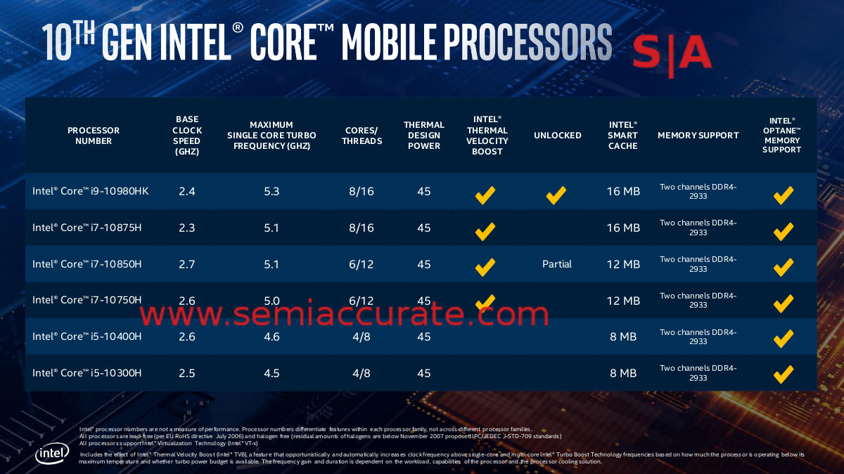 So in the end what do you have? About as close to nothing new as you can get and not have the OEMs laugh at the new stickers they need to put on the ‘updated’ laptops. The 10-Series -H parts code named Comet Lake bring nothing new to the table other than a feature tweak and tighter binning. In the real world you can expect a 100MHz speed bump for fleeting milliseconds at peak turbo on some SKUs and that’s it. Did we mention AMD’s Ryzen 4000 Mobile parts beat the same chip with a 9-Series sticker on it like a drum?S|A