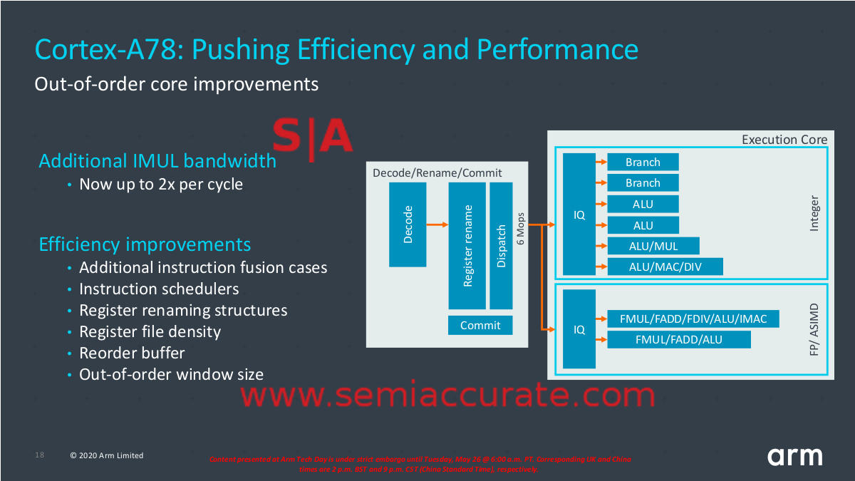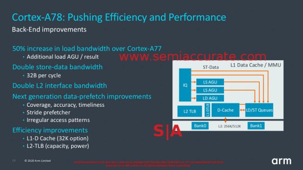 On the front end the A78’s big change is to double the number of taken branches, this is our attempt at marketing hype because it goes from one to two. Prefetch bandwidth is up, L1 misses are prefetched earlier, pipelines bubbles are hidden better, and the prefetch is more accurate. As mentioned earlier the L1 caches is now available in either 32K or 64K sizes for an OEM to chose from.