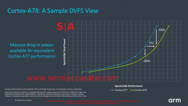 As you can see the raw performance of the A78 doesn’t go up by a tremendous amount but the efficiency does. Energy use is often constrained by cooling so this is where the 20% sustained performance for the A78 number probably came from, for the same energy it can do 20% more work over the long term. Given the graphs that figure seems to be a bit conservative but the end result will be quite useful in a phone.