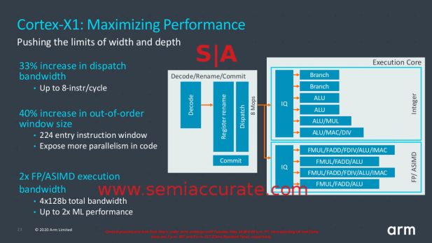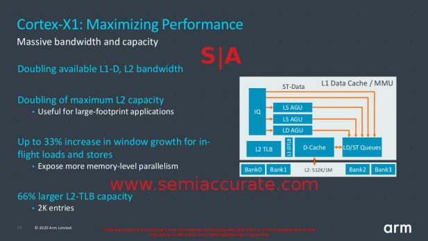 When it comes to memory, double is the operative phrase for the X1. L1D and L2 bandwidth are doubled, L2 capacity goes up by, wait for it, two, L3 can be 2x the size, and the L2-TLB is 66% bigger. Bet you weren’t expecting that one unless you actually read the slide above. If you did the 33% larger load/store window won’t be a shock either. In any case the take home message is that the memory subsystem of the X1 is up to the task of feeding those additional units.