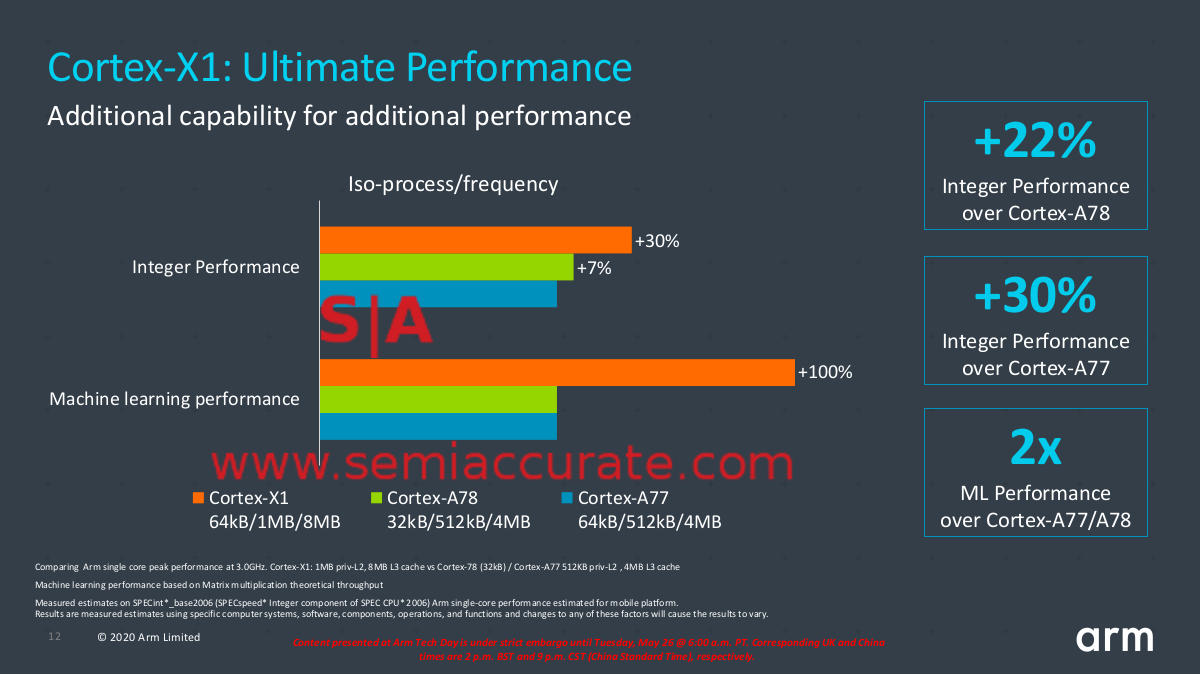 As you can see the energy and area graphs are left out but ARM is pretty clear that the X1 is not more efficient than the A78 nor is it smaller. The exact details of what the X1 brings to the table were not disclosed this time around but we expect them to be at a future date. A fair chunk of the integer performance comes from the wider issue design and larger caches but the ML Boost, pun intended, comes directly from 2x the NEON units. The X1 is about what you would expect, more performance from more area and energy.