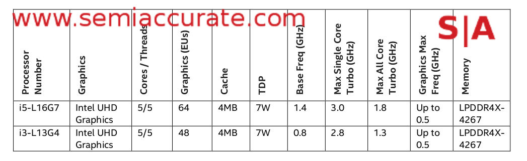 There are two Lakefields, i3-L13G4 and i5-L16G7. If the names don’t tell you all the specs you need, here is a convenient table with all the info we have on Lakefield at the moment.