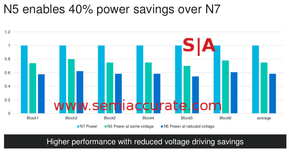 All of this is interesting but doesn’t really take into account a block built from the ground up to take advantage of the 5nm process. Such a device would probably gain a bit more here and there depending on the exact makeup of the block. That said these numbers are fairly close to what you will see in the real world rather than the nebulous and usually unreachable PR numbers the foundries often lay out. But what does it translate in to for actual devices?
