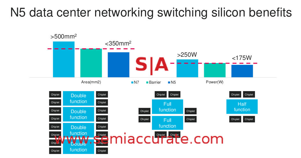 Marvell laid out three scenarios based on the larger vertical markets their ASIC division targets. Below is one based on data center switching SoCs but AI chips and 5G baseband processors were also given similar analysis. The idea is easy enough, you have a performance target and cost target that the customer sets which is represented by the middle line. What is achievable on 7nm and 5nm are on the left and right respectively.