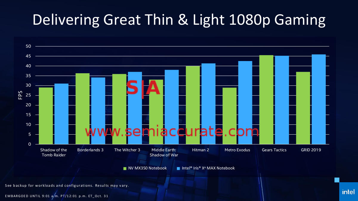 Then we come to one of the two slides that mention gaming performance even though that may be too strong a word. Here we see a Max notebook, still not sure if that is integrated, integrated with LPDDR4, integrated + discrete, or integrated + discrete + memory, barely beating a bottom of the barrel, two generation old Nvidia Pascal MX350 mobile GPU. Worse yet it although the Intel solution does indeed break 30FPS, the average is in the 35FPS range, that is well short of the 60FPS most consider to be what gamers need as a minimum. The second slide shows the Max variant going slower than the non-Max in half (1 of 2) games. Uh…