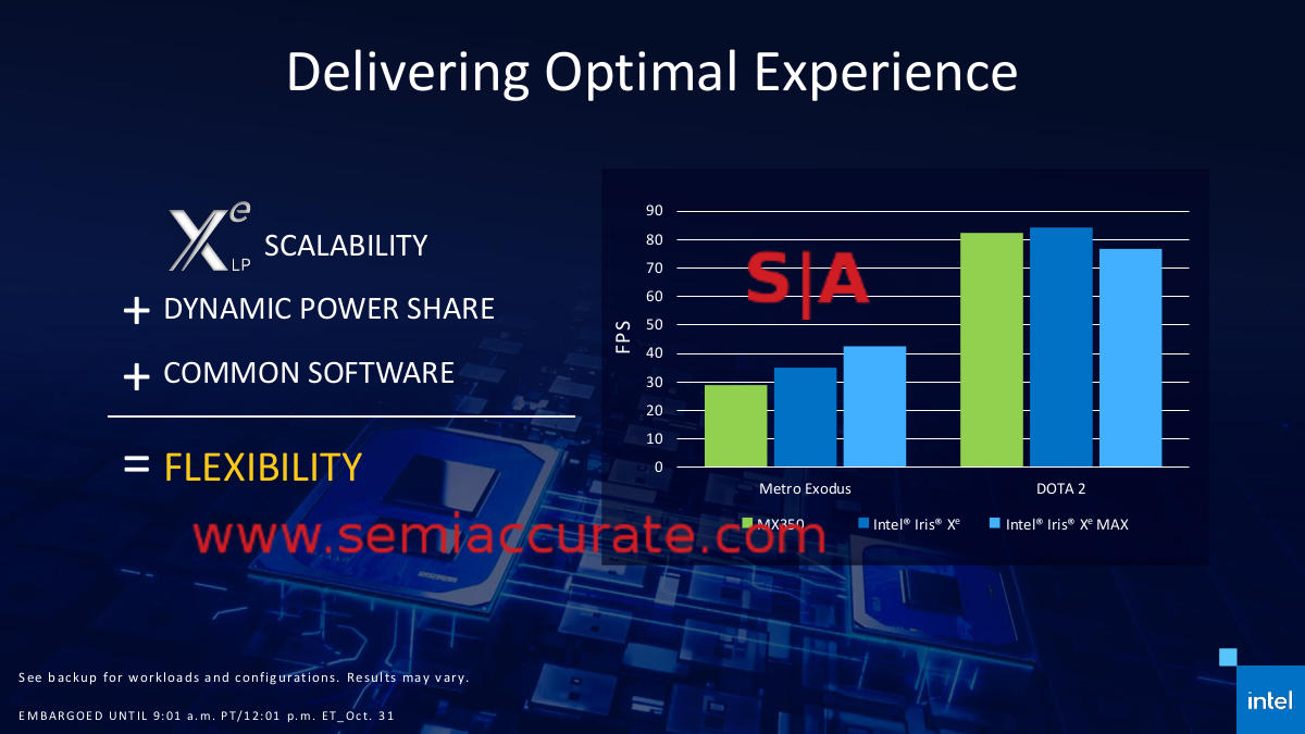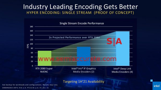 Intel goes on in another graph to show their encoding prowess and how the two encoders in an external GPU are additive to the two internal ones in an almost linear way. That is nice and beating a last gen desktop GPU is too, but what are we seeing? The 1H’21 availability, is that for hardware or software? Is it upgradeable? Will it actually come out? Will Intel use this capability as an upsell? No clue which again makes the claims worthless. Also do note the glaring lack of comparisons against any AMD mobile product, no points if you guess why.