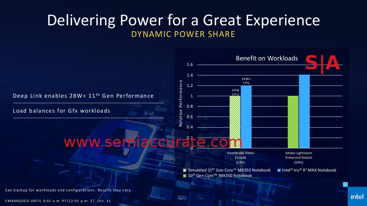 The first of the sparse data that Intel tosses out doesn’t actually seem to be a win. They show a 10th gen part, an i7-1065G7 with an Nvidia MX-350 GPU, a Tiger Lake i7-1185G7 with an MX350 (Simulated), and an plain i7-1165G7 which is the “Max” one. Based on the numbers shown, the Nvidia bearing parts are a clear win in the first graph, 40% less power for 20% less speed is a clean kill in mobile, why Intel showed this graph is beyond us but there might be an explanation. That said they wouldn’t answer questions so it is likely accurate. The second set of bars omits the power numbers so it is likely less favorable to Intel than the first. Who allowed these to be published without explanation?