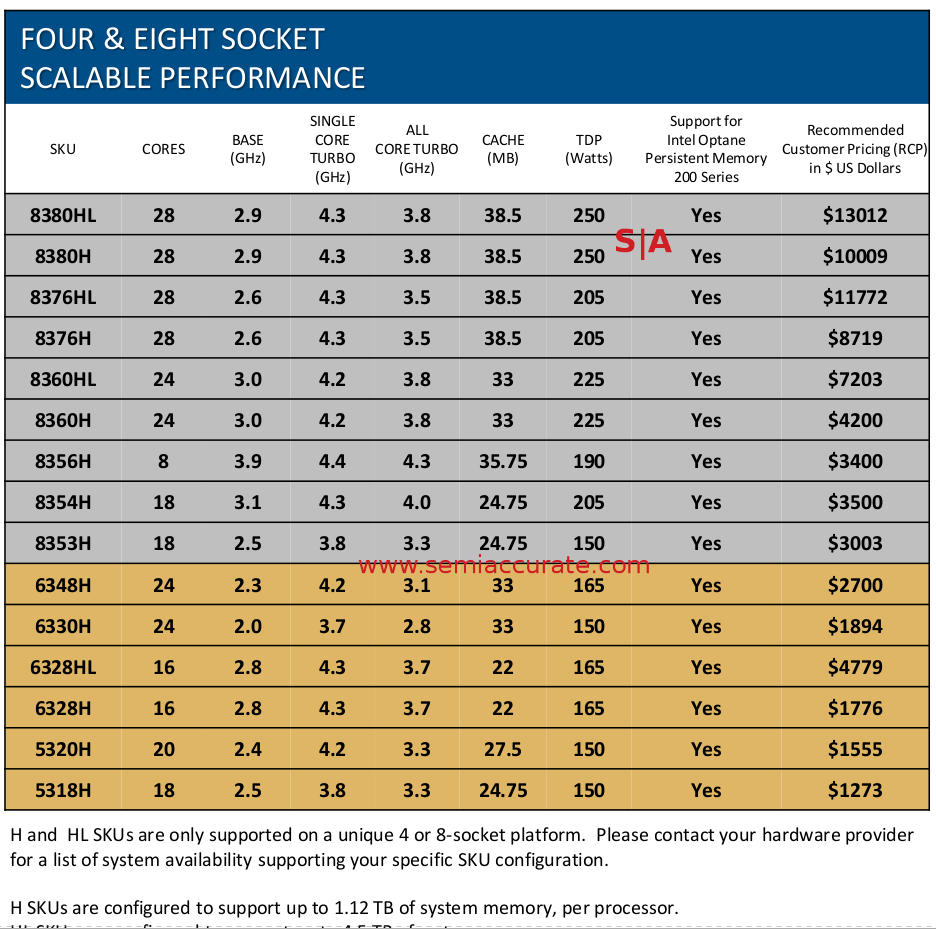 The first thing to notice is that the 4/8 socket models make a comeback as a separate line after being folded in to the mainstream models with Skylake. Curiously this brought an attendant price hike to all models on Sky/Cascade, something which Intel has been forced to retreat on with Ice Lake-SP. These models bear an H suffix but have crippled memory caps of 1.12TB. If you want that fuse not blown you need to step up to an HL model for an extra $3003 or so per CPU.
