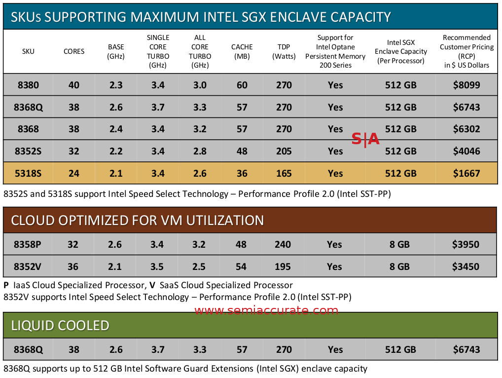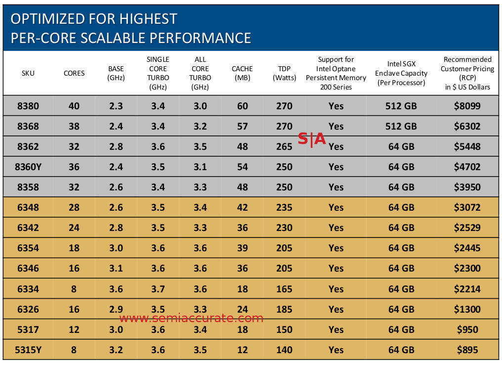 2S SKUs are divided into what Intel calls Scalable Performance and Optimized For Highest Per-Core Performance, slight name changes from the list we published last week. The biggest thing to notice is that Intel is now extorting customers over SGX enclave size, if you want more, you have to pay just like the much loved memory tax. Luckily for customers, no one actually wants SGX at all so no one will actually have to pay. The psychological damage still remains, Intel is making customers realize they are getting inferior products once again even if it is technically irrelevant to them. The own goals just don’t stop with Ice Lake-SP.