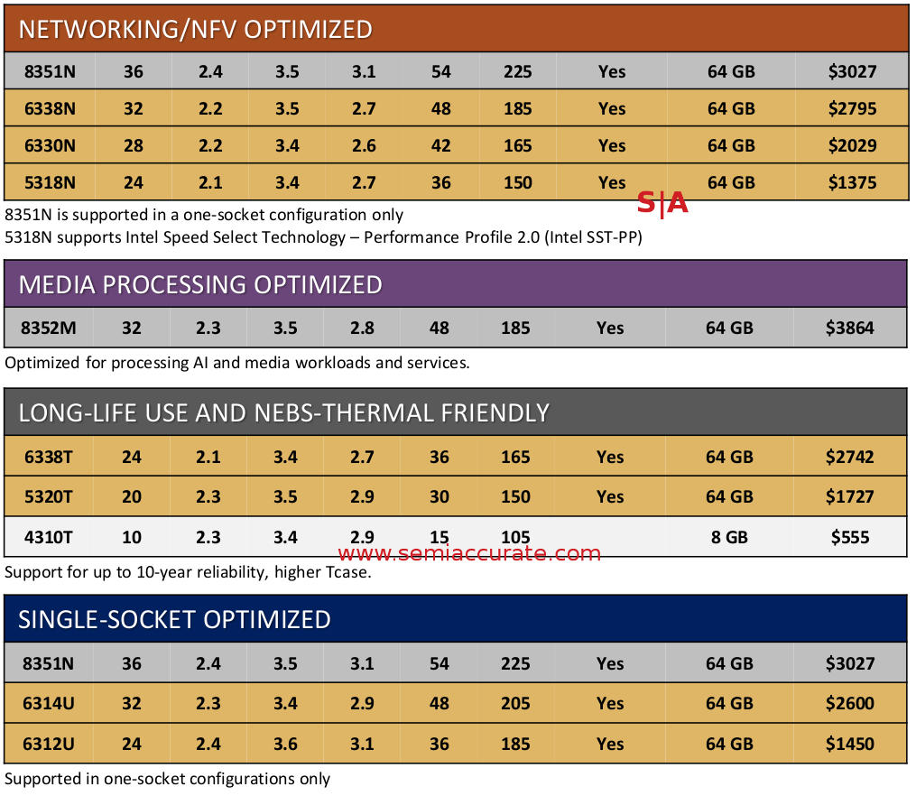 There are some market specific SKUs this time around too but nothing out of the ordinary. Cloud Optimized, Networking/NFV, Media Processing, and Long Life Packaging are essentially carry over lines. The liquid cooled 8368Q is interesting but nothing special, Intel has been pushing for liquid cooling since the Cascade-AP/9200 in order to pave the way for higher TDPs. Expect this to become much more prevalent in the future, TDPs aren’t going down at any vendor. Lastly there are the single socket models, four in fact, running from 24-36C.