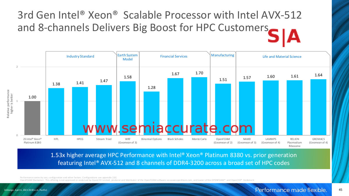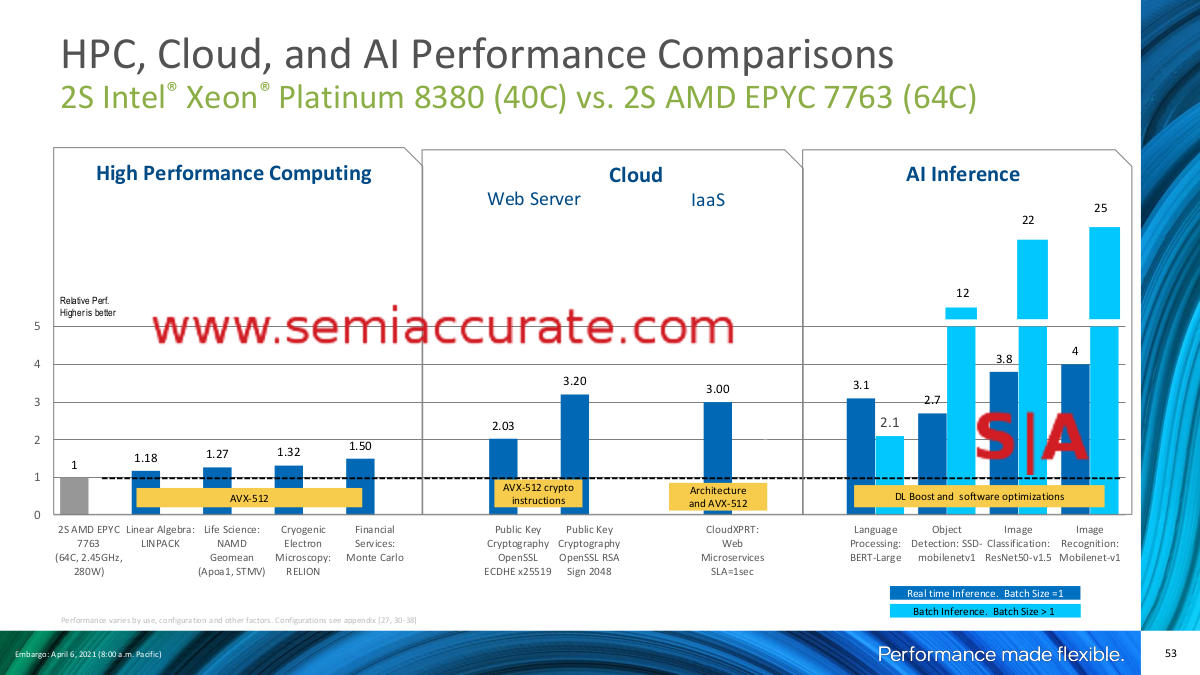 Intel goes to great length to show that when software is rewritten or recompiled with their new instruction sets, it beats AMD’s Milan silly. In this case, Ice-SP does indeed beat Milan silly but as we said earlier, no one in the real world does this, it is too expensive and ties things to one CPU architecture that is significantly slower and consumes more power at everything else. Reworking software like this has no ROI in all but a few corner cases. We feel compelled to point out that this is the same argument Intel spinners were using against ARM a few years ago. Also for some reason, Intel expects customers to optimize for their CPUs but not for the competition, something that strikes SemiAccurate as a tad unrealistic.