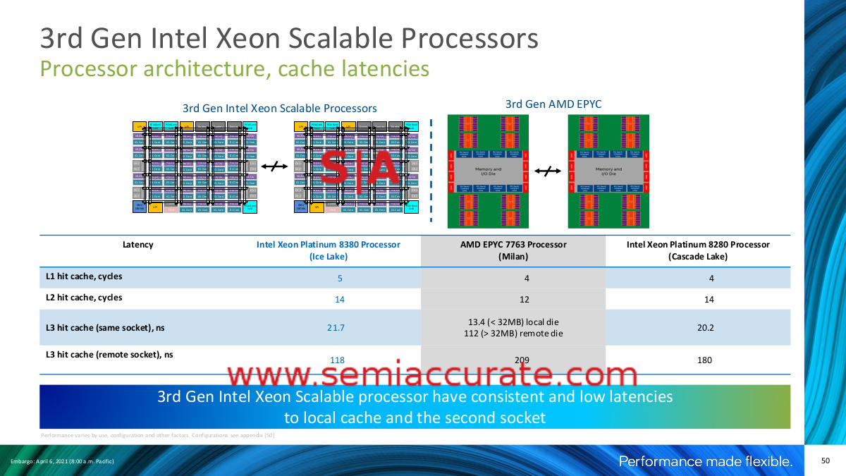 Then there is this one, the old saw about memory latency which we will add is absolutely true. Intel has a monolithic design that allows them to avoid (relatively) slow hops between chiplets. What Intel somehow forgets to mention is that almost no one uses this type of configuration in latency sensitive workloads because it is the worst way to do things, instead users partition. You know, VMs, that newfangled tech that seems to be everywhere now. AMD deployments almost always put a VM or more per CCD so this is a moot slide in the real world.
