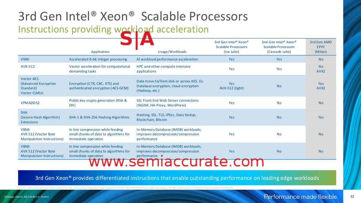 Ah yes, Ice Lake-SP has VNNI and AVX-512, AMD’s Milan doesn’t, that covers 6 of the 7 rows. The last is a SHA instruction that both have. Blue crystals are better than green. Nowhere does it mention that no one, other than a few halo customers who Intel likely enabled with armies of engineers, will recompile their code to use these instructions. They also don’t mention AMD pummels Ice in real world testing that these instructions are supposed to support. See Anandtech and Serve The Home for details on those numbers.