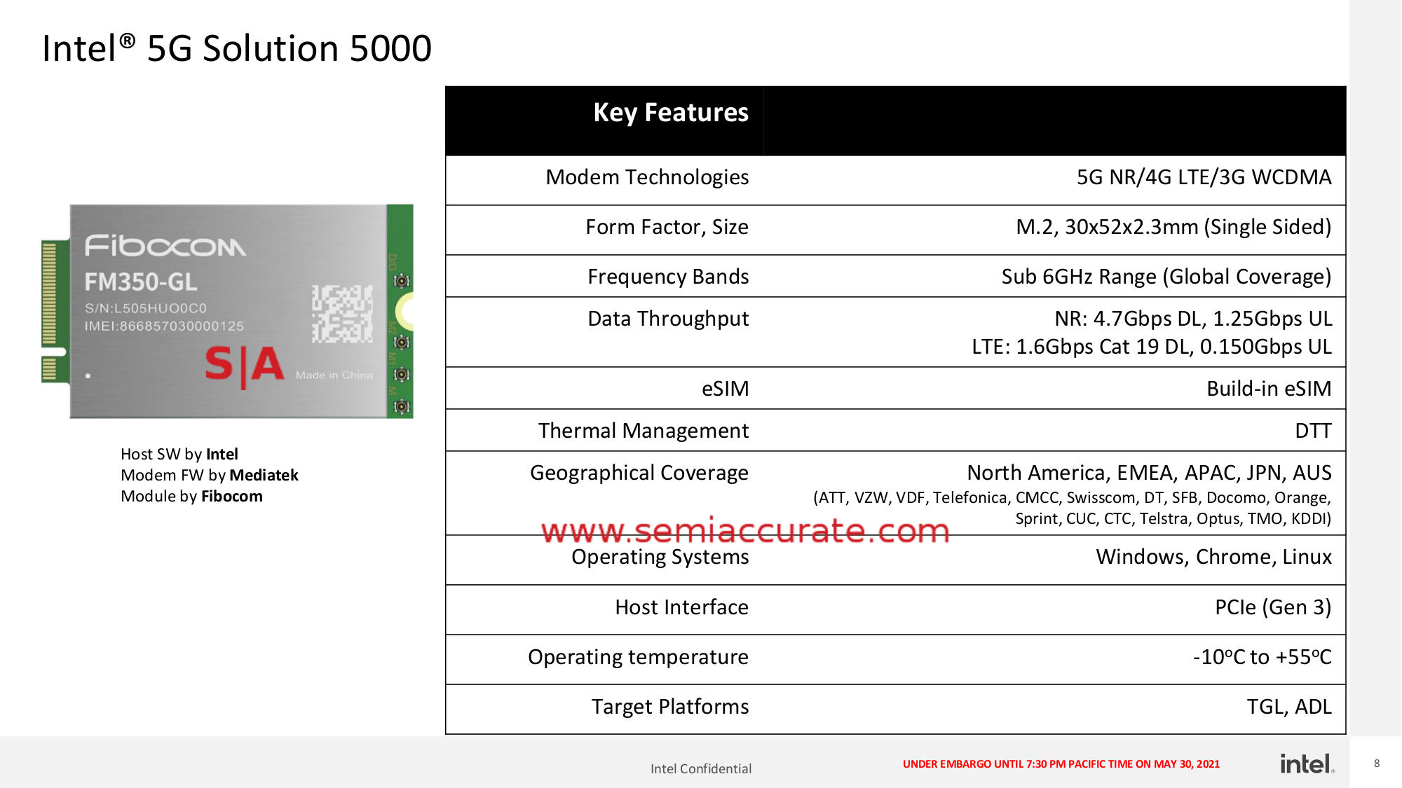The module itself is made by Fibocom, the silicon is by Mediatek as we previously mentioned, so what does Intel do? Some software. How much? They won’t say but it is unlikely to be the bits they want you to think they make. Remember what we said about not wanting critical minds to view their presentations before the official spin got out? This is an “Intel modem”, really they say so.
