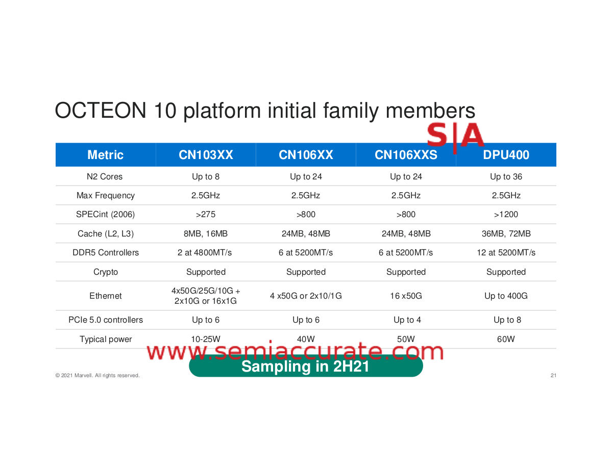 There are a lot of goodies in this diagram starting with the fanless bit under TSMC 5nm. The smallest CN103XX can run as low as 10W meaning it will fit nicely on a PCIe card, PCIe5 in this case. That puts Octeon 10 among the first PCIe5 devices out there, not that there will be anything to plug your sample in to but that isn’t Marvell’s fault. In any case you actually need that speed if you have any hope of feeding a 400GbE port, the 16Gbps/lane of PCIe4 mean 256Gbps best case.