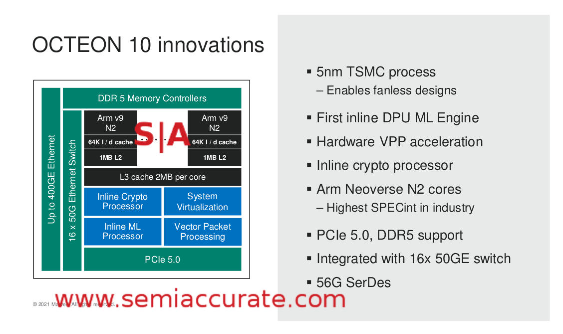 At a high level, the Octeon 10 line is an ARM Neoverse N2 cored SoC with all the telco, security, and networking accelerators built in. If that isn’t enough, Marvel threw in their switch block so you have 16x 50GbE ports available on top of that. If you haven’t been paying attention, this fits the definition of DPU, basically CPU + accelerators + high speed IO that is being tagged to everything of late but in the case of the Octeon 10, it fits rather nicely.