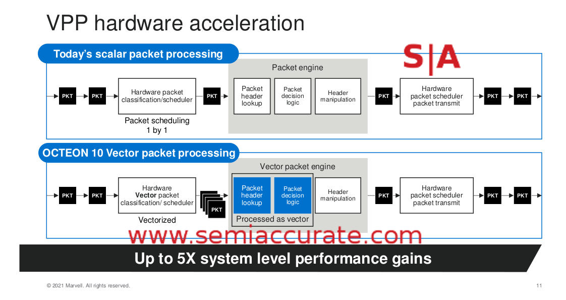 One of the more interesting accelerators is the VPP or Vector Packet Processing engine. What this does is batch multiple packets and process them at once as a vector. This SIMD processing means you only have to do one setup and a single set of loads for multiple packets rather than one for each packet saving a lot of time. Marvell says the latency gain from batching is more than made up for by the added efficiency of the single setup so it is a clear win. VPP isn’t new to the Octeon line however but this is the first time Marvell has put much of the functionality directly in hardware.