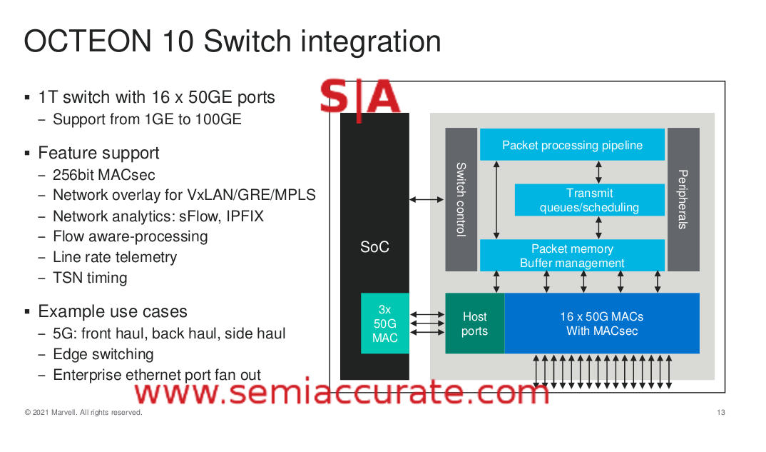 The last major part of the SoC is the switch and it packs some serious numbers. 16x 50GbE ports meaning up to two 400GbE links or more likely a pair of redundant 400GbE ports for the device. PCIe5 and DDR5 mean that the chip can feed those ports and Marvell claims the accelerators will work at 400+Gbps/line rate so that is about all you need. More important are all the telco features listed above, RANs are the primary market for Octeon 10 and these ports should make that set quite happy.