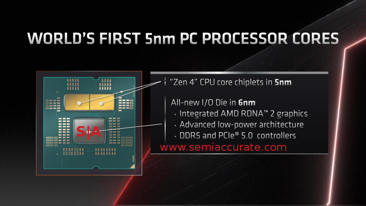 The Zen 4 cores in 5nm has been known for a while but the IOD in 6nm confirms what was long suspected. The biggest surprise of the day however was that AMD is putting RDNA2 GPU cores on the IOD so this generation of multi-chip Ryzens will have integrated graphics. We aren’t sure if this is a good idea for the high end gaming parts but it will give AMD a lot of flexibility on the lower end of the stack.