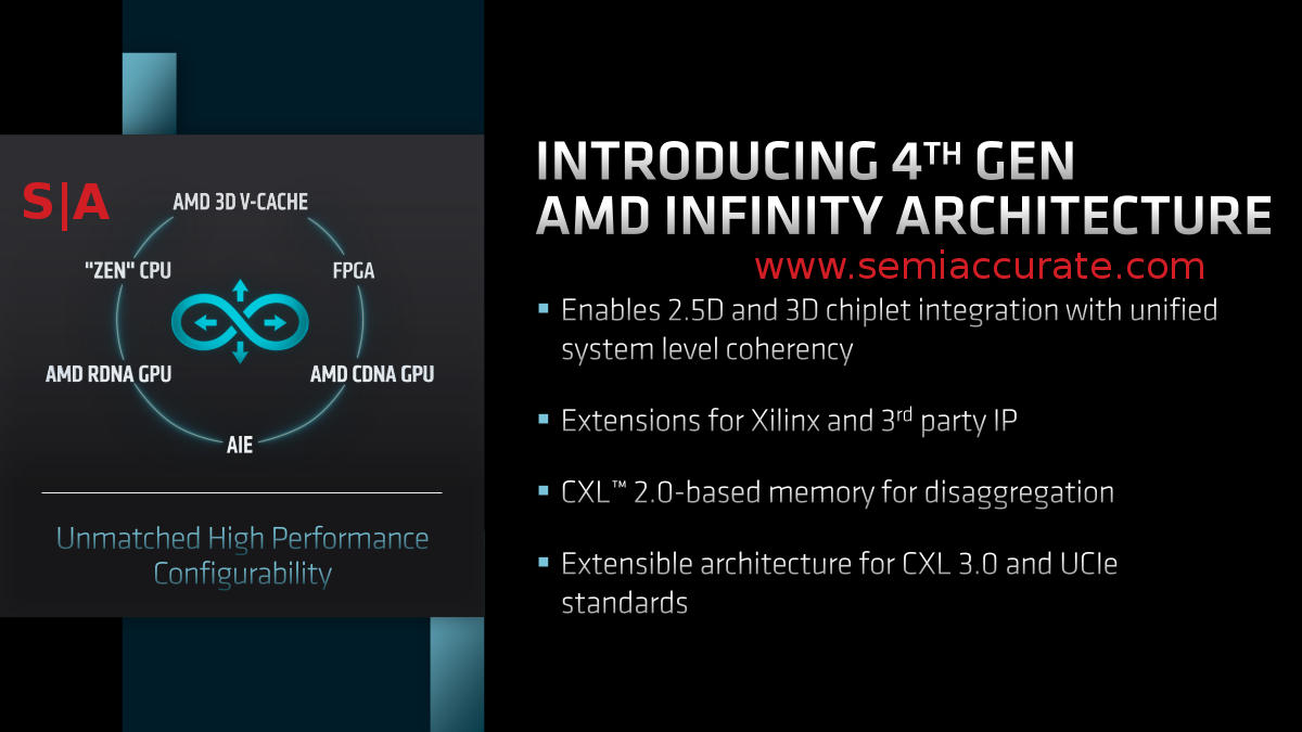 That part about enabling 2.5D and 3D chiplets is nothing more than a breathless statement that IA is indeed physical layer agnostic. Completely true but nothing that wasn’t revealed in 2017. The extensions for Xilinx and other IP is nothing more than a spin on the fact that CXL and UCIe will be a standard for such things in the future and AMD supports them. This was again widely known and publicly admitted to over a year ago.