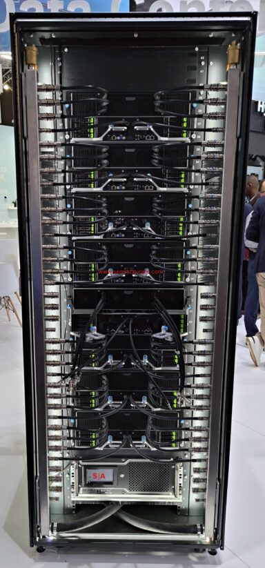 Next up is the Gigapod which looks to the untrained eye like a rack of servers. Each pod has two main types of rack, a compute rack and a central node. A full Gigapod is made up of four compute pods and one central node for a five rack ‘device’. The racks are water cooled with the controller at the bottom. The variant pictured above is a compute node.
