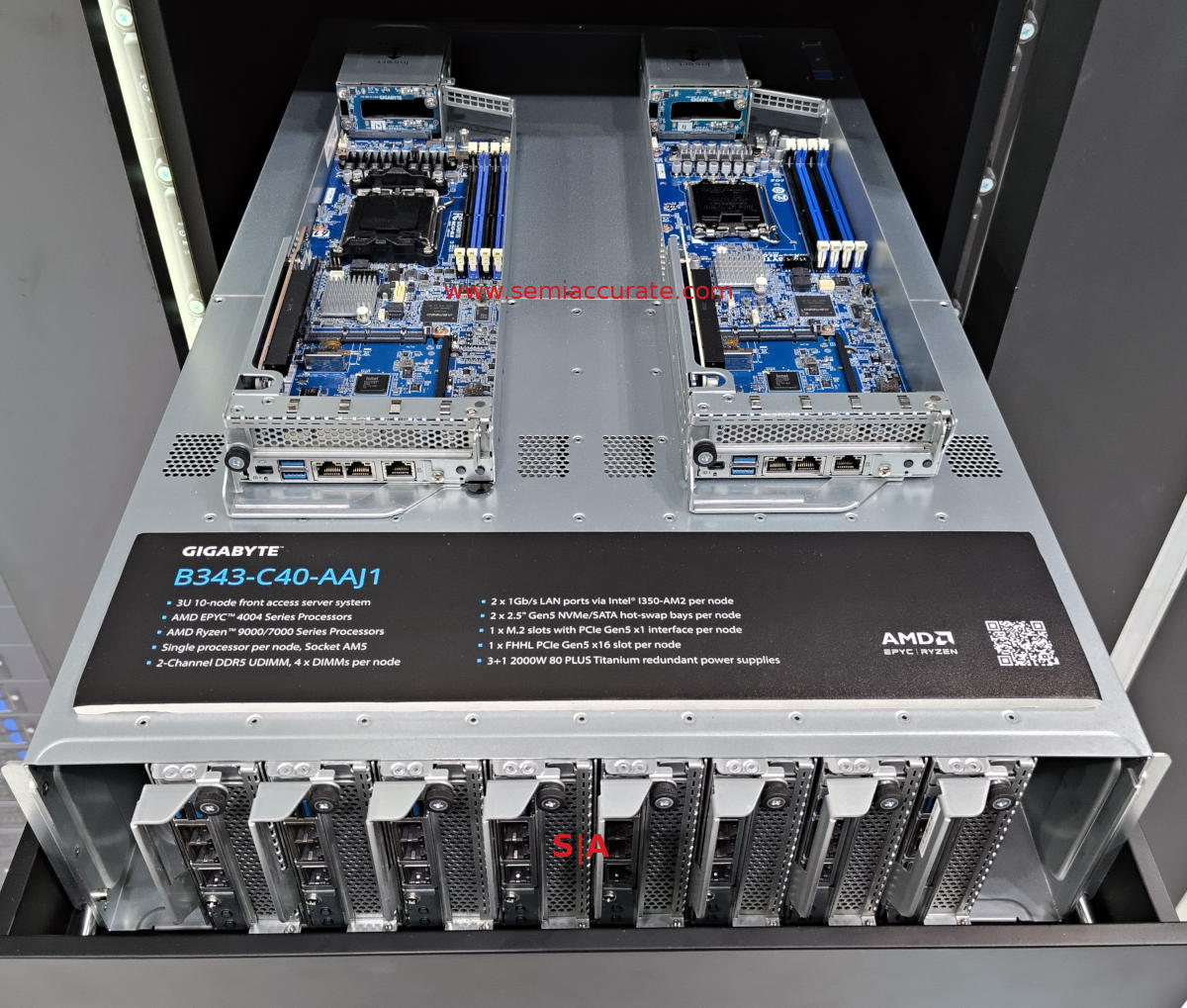 Socket AM5 can take Epyc 4004 or Ryzen 7000/9000 CPUs and supports 2 DIMMs per channel. This is basically a pimped out desktop with ECC and hot swap features rather than a full blown ‘server’ blade. To some this may seem underwhelming but there is one upside, you can put an APU in it for graphics or video workloads, plus you can add a GPU on top of it for more graphics grunt should you desire. If your workload is more than pure compute/HPC, these blades offer some nice options. All this said, more conventional blades with other CPUs, both AMD and other, are sure to follow in the near future.