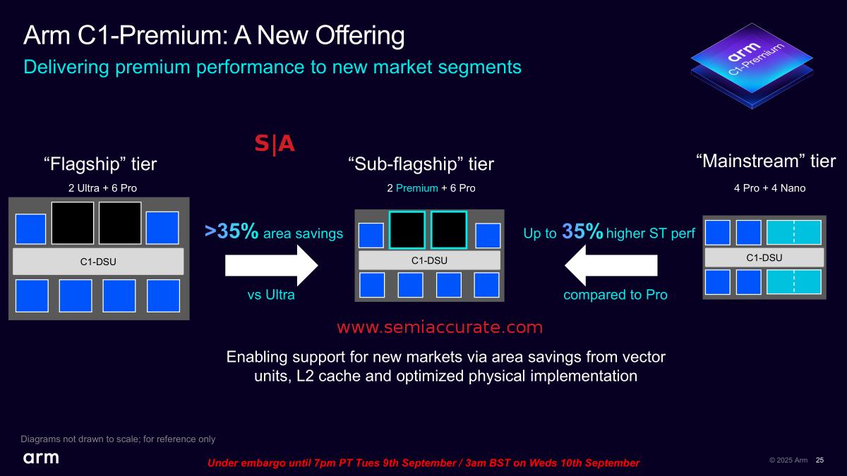 The big change here is that the fourth CPU core class, Premium, is a little less than the Ultra which was the X# cores of the past few years. If you are wondering why anyone would bother with yet another core type, other than to prematurely age the wizards who write schedulers, there is actually a good reason. The slide above points out that going from 2U+6Pro to 2Pre+6Pro configs saves 35% die area for only 25% less performance. Sure the core clusters are a minority of the SoC die but this is a substantial cost savings for a claimed 25% performance loss. Do note this is for a 2MB Ultra vs 1MB Premium core.