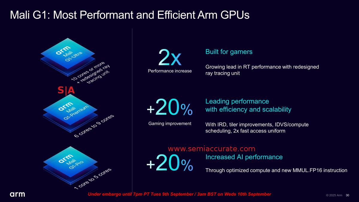 That brings us to the enthusiast’s favorite topic, GPUs and the new Mali G1 family of devices. At a high level there isn’t nearly as much change here as there was on the CPU side, three configurations that are more unit counts than significantly different IP blocks. The G1-Ultra is a 10+ core beast with mandatory raytracing, G1-Premium goes from 6-9 cores and doesn’t have to have raytracing, and the G1-Pro is 1-5 cores. Within the cores things are very different, but again that is for another article.