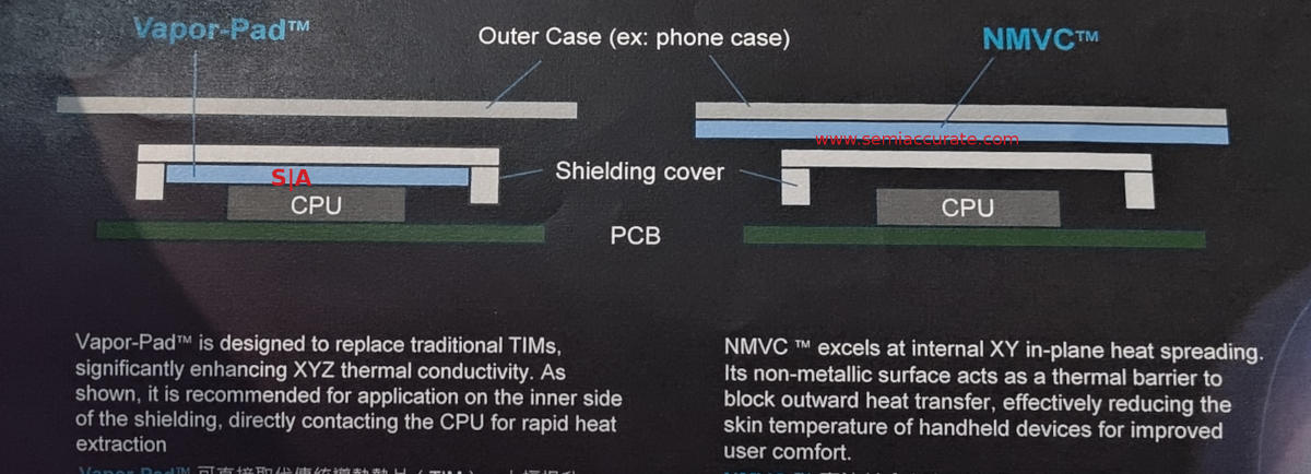 You may notice the diagram on the left of the slide has the term NMVC on top of the CPU cover rather than below it like the Vapor-Pad. That is the non-metal vapor chamber mentioned before and pictured above. What is it? Sit down for this explanation but it is a vapor chamber made of non-metal materials. Bet that one took you by surprise.